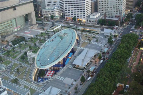 遠看很像一個大飛碟的オアシス21頂樓有一片視線可以貫穿整棟建築物的水池。