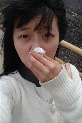 用衛生紙擦到紅腫的鼻子還有被煙霧刺激到紅腫的眼睛,