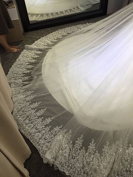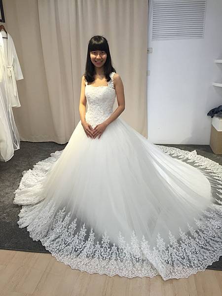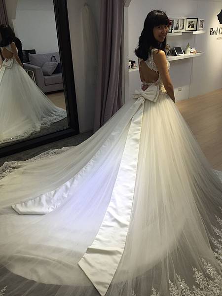 第二套為肩帶式露背平口白紗,上半身縫有帶亮片的小花。