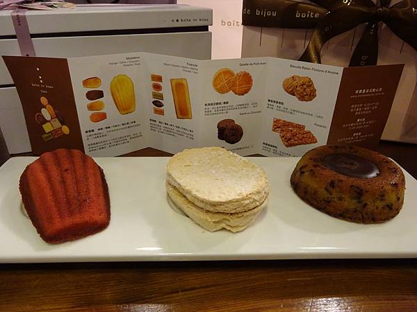 品項共三種,由左到右分別為玫瑰瑪德蓮、達可瓦茲、虎斑蛋糕
