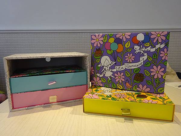 抽屜式的禮盒共一款四種顏色(粉紅/粉藍/黃/紫),可自由選擇要單層/雙層/三層