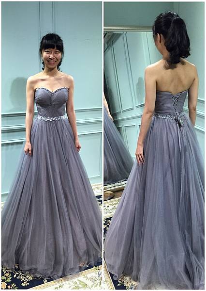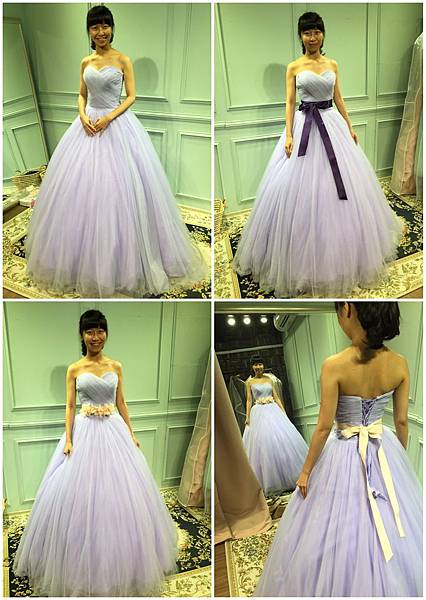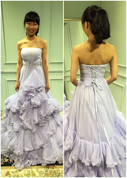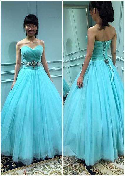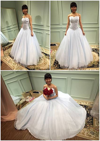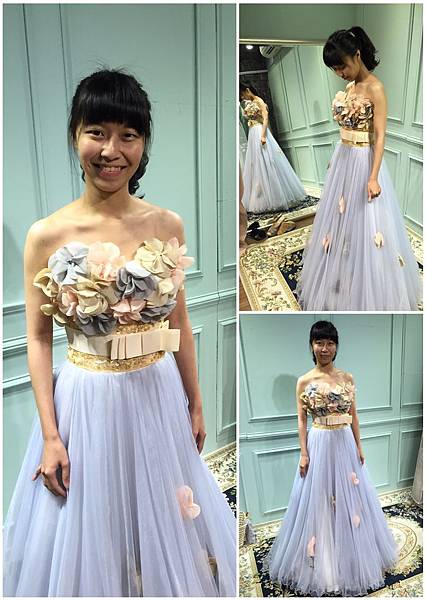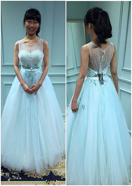 ②胸前抓皺有一點小花及亮片點綴,淡藍色澎裙,簡單典雅。