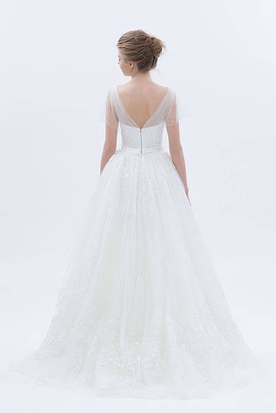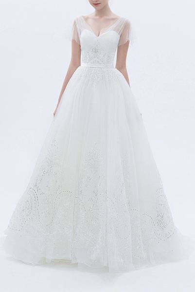有袖紗質肩帶,桃心領澎裙,內有魚骨支撐,亮片繡花用得恰到好處質感滿分,