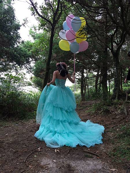 頭戴花圈搭配森林當背景真是再適合不過,但手上的氣球得小心翼翼保護不被樹枝戳破,