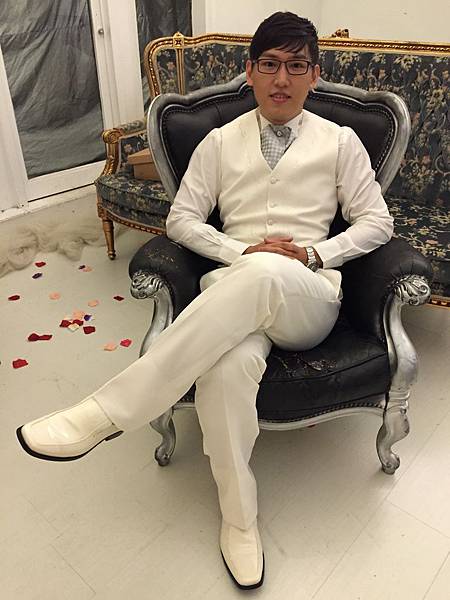 趁工作人員在架素色背景時的空檔按許先生要求拍攝的偽上流社會照,最後在灰背景前拍下不可或缺的傳統婚紗照。
