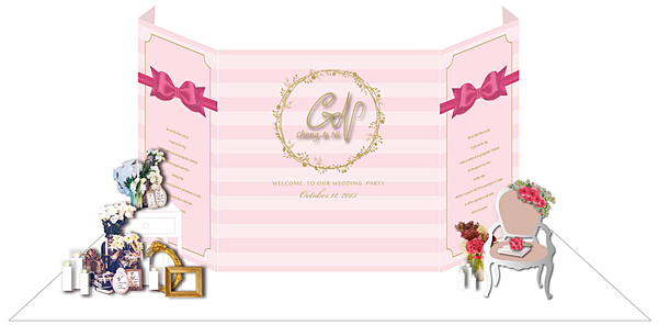提案一 : 立體LOGO/立體蝴蝶結/白色地毯/小邊桌/古典椅/花藝