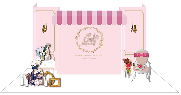 提案二 : 立體LOGO/雨棚/白色地毯/水晶壁燈小邊桌/古典椅/花藝/蝴蝶結裝飾