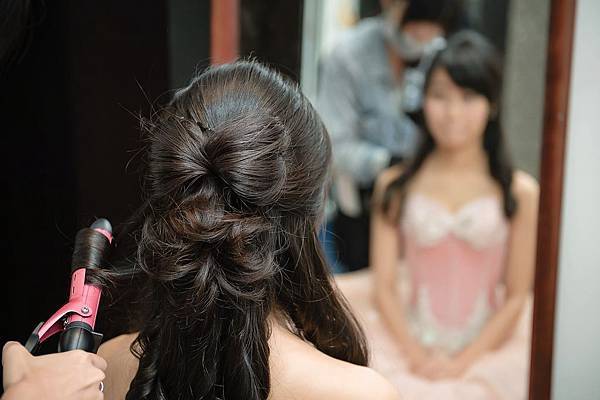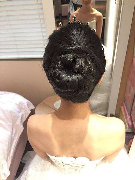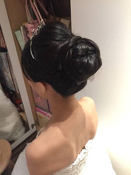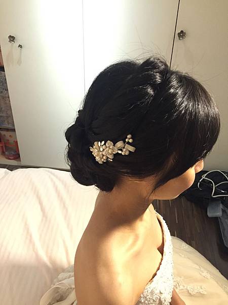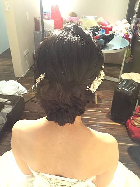 考量到敬酒時已經有一隻手要拿酒杯,不希望另一隻手還要一直去撥頭髮,所以採用這個造型。