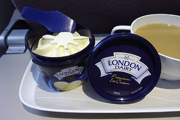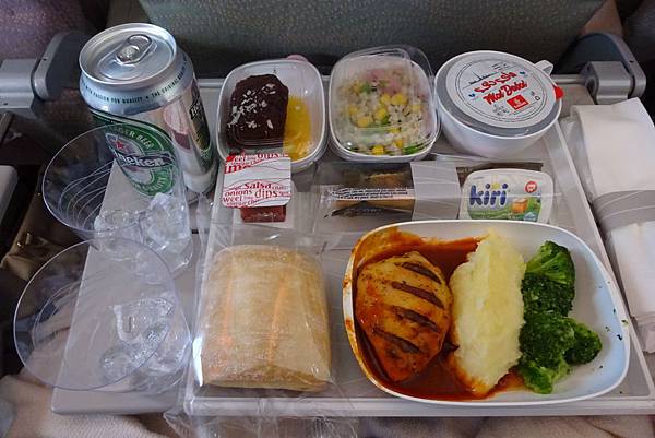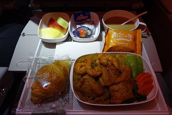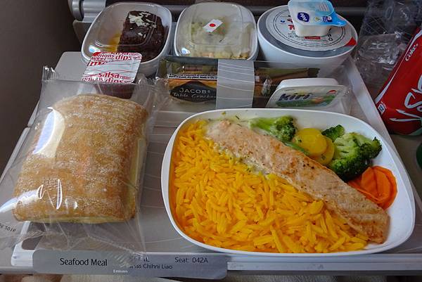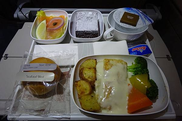 大約降落2小時前會開始送早餐,這餐的海鮮餐主菜讓人還想再續三盤。
