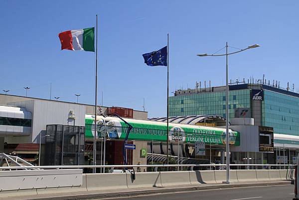 一走出機場就會看到飄揚的義大利國旗和歐盟旗幟,