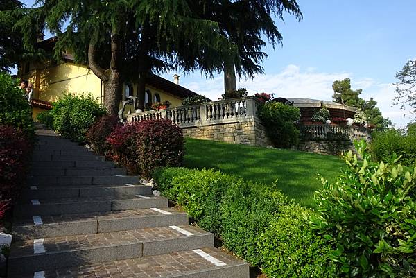 順著一大片綠油油的草坪而上,就會看到餐廳的大門口。