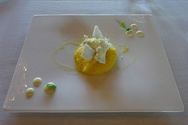 第三道是金黃色的玉米粥鋪上白色的鱈魚,清淡但很有飽足感。