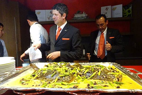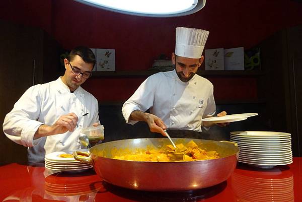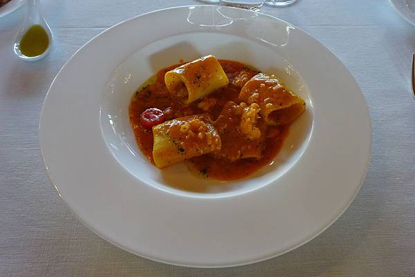 第四道主食是燉貝類番茄粗管義大利麵,大鼻子廚師很開心的在分盤。