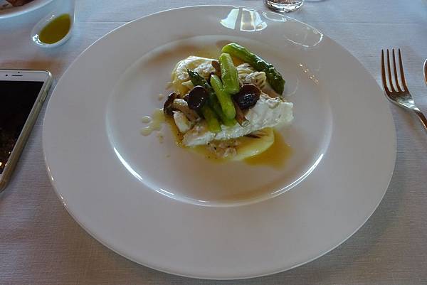 第五道主餐是烤多寶魚,用蘆筍和蘑菇點綴。